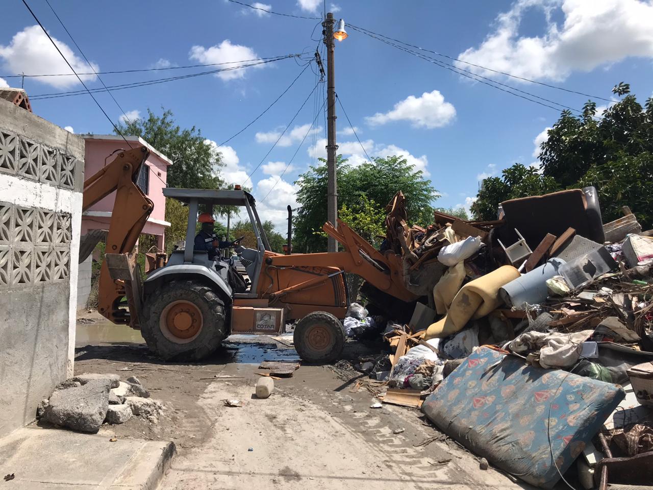 En respuesta a la instrucción del Gobernador Francisco García Cabeza de Vaca en la colonia Lázaro Cárdenas se utiliza maquinaria y equipo pesado como retroexcavadoras y camiones de carga en los trabajos de descacharrización.